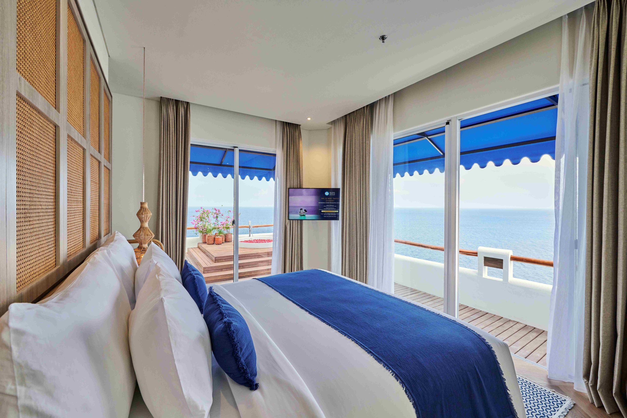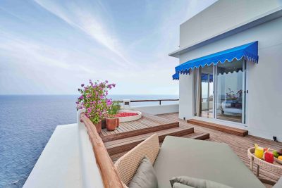 Our luxurious rooftop room with a breathtaking sea view and a unique outdoor bathtub experience. As you enter the room, you will be greeted by stunning views of the ocean from your balcony.